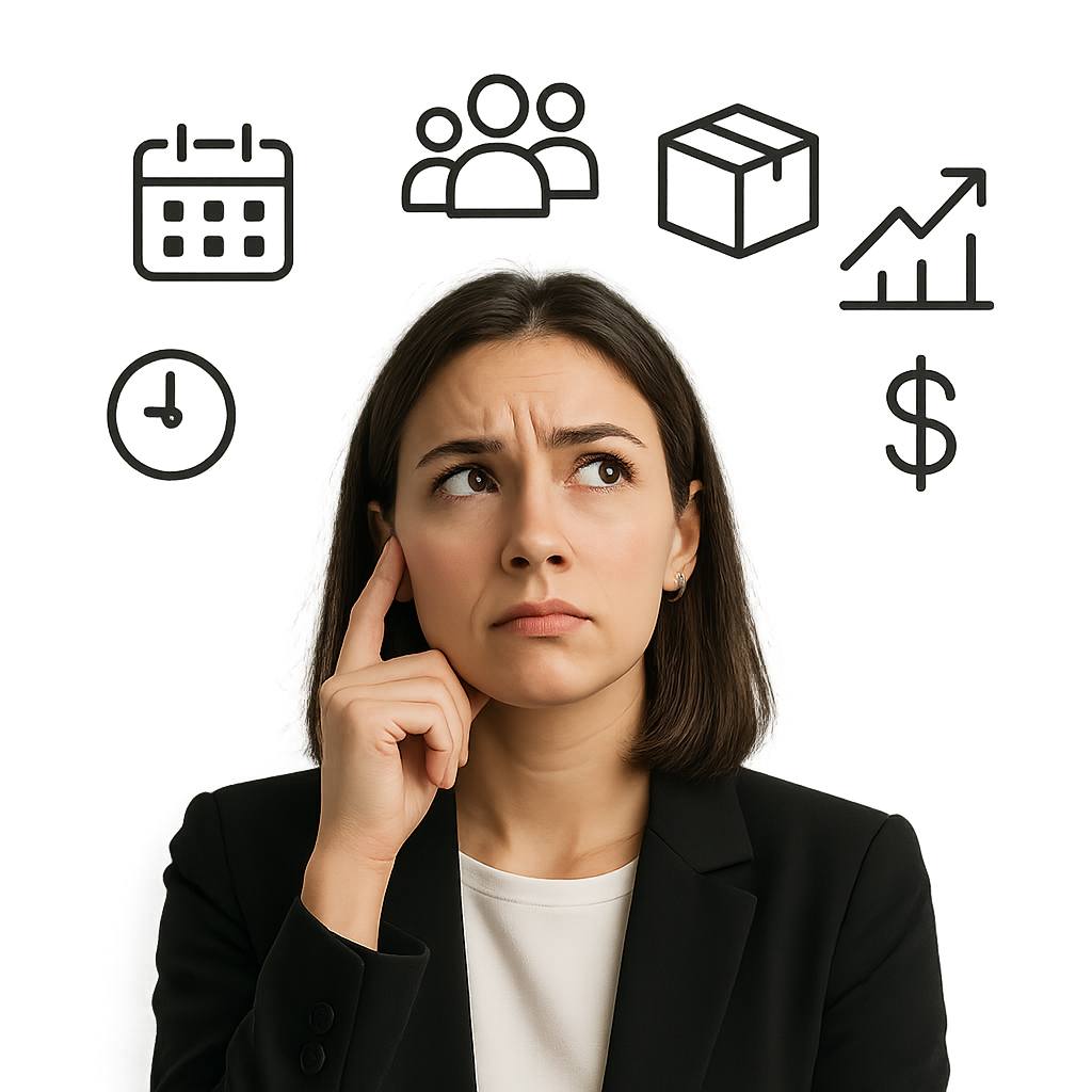 Jovem empresário com expressão de dúvida, olhando para cima com Três balões de fala com dúvidas reais e ao lado um quadro de tarefas com check verde nas ações implementadas.
